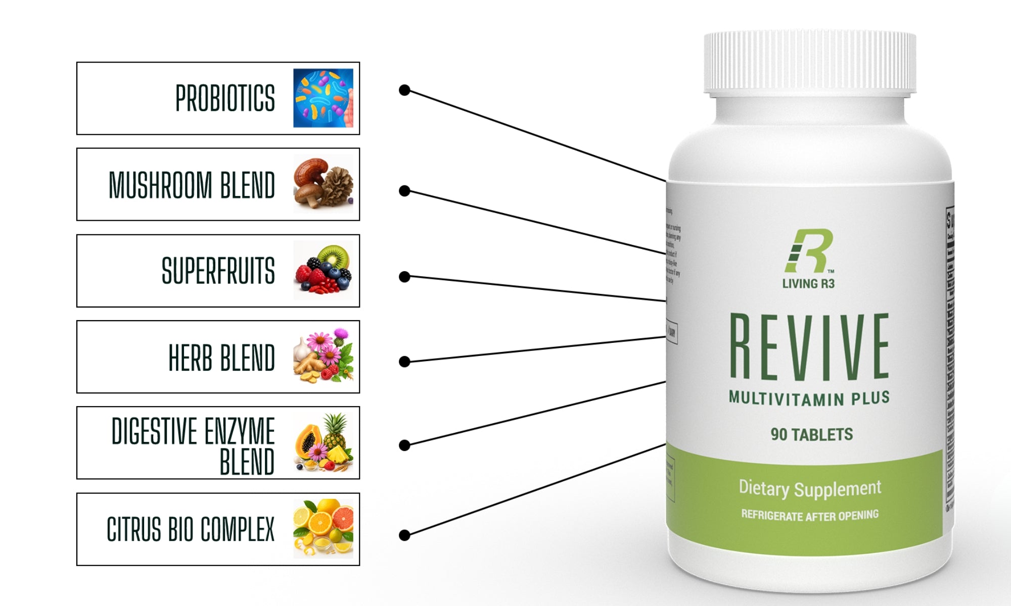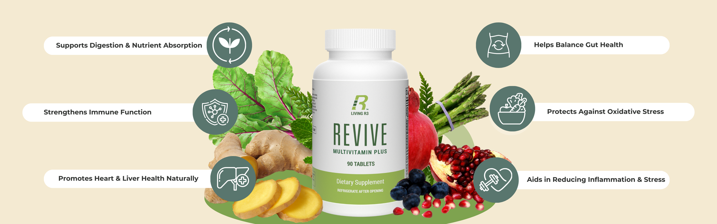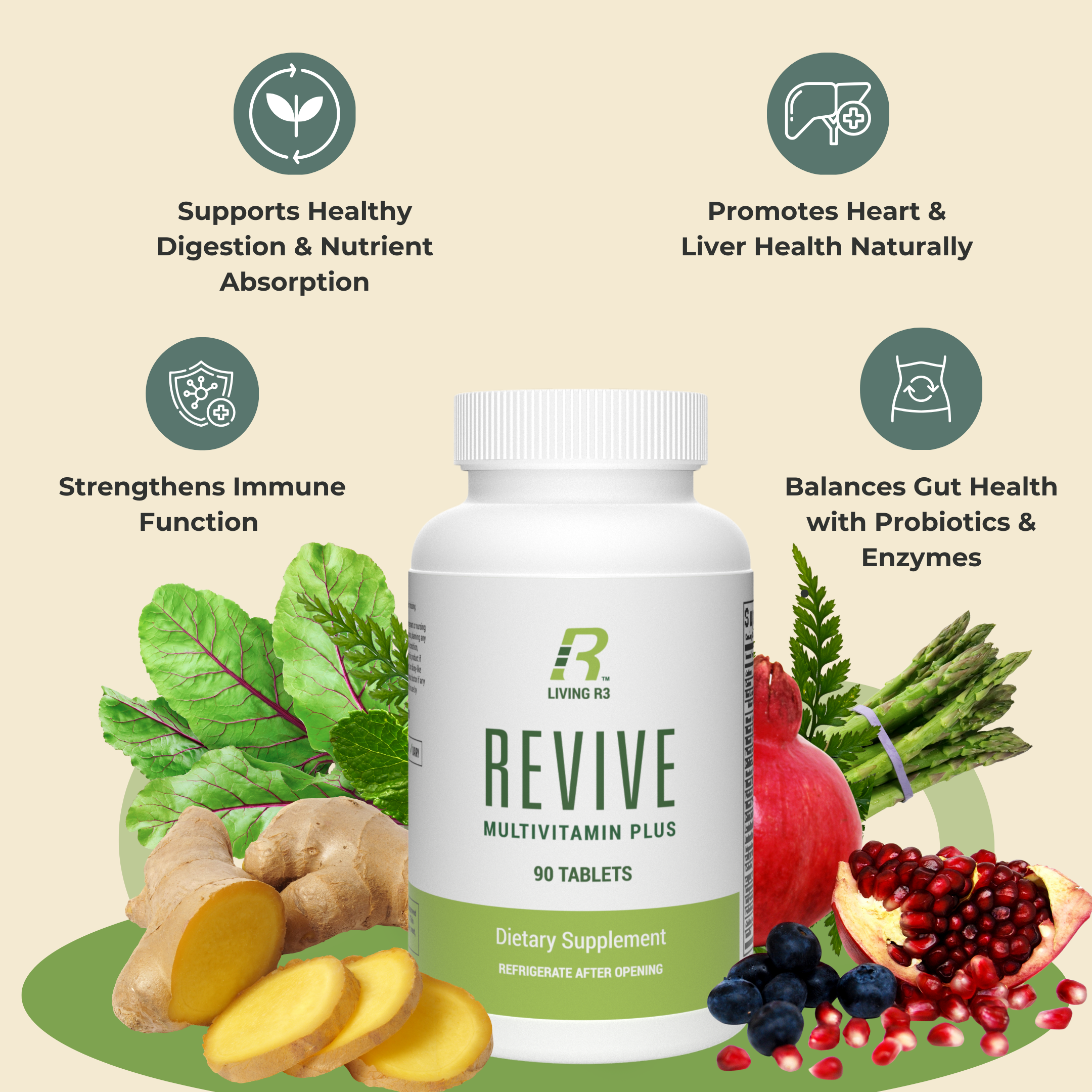 Revive Plus is an advanced multi-mineral, multivitamin formula created to face the daily challenges your body encounters head-on. Stress, aging, environmental toxins, and nutrient gaps all take a toll—draining energy, slowing absorption, and weakening resilience over time.